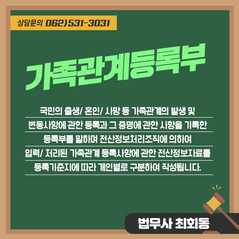 최회동 법무사 062.531.3031 생년월일 출생연도 정정과 광주성 본변변변, 개명 등 등록부 정정! 해당 사안의 전문성이 풍부한 최회동 법무소에서는 의뢰인 입장에서 하나부터 열까지 함께하고 있습니다.해당 분야의 무수한 노하우와 경험을 겸비한 전문 법무사와 함께라면 더욱 빠르고 정확하게 해결할 수 있습니다~!