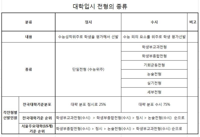 나는 지난 10년간의 경험을 통해 위와 같은 놀라운 결과를 얻을 수 있다는 것을 알고 있습니다. 이 글을 통해 일반고 학생들만 가지고 매년 SKY, 의과, 치대 학생들을 배출하는 노하우를 조금이나마 공유할 수 있다면, 교과목의 기본 개념부터 시작하고 싶습니다. 이제 막 시작하시는 분들에게 큰 도움이 될 것 같아요. 아래 요약된 내용을 바탕으로 ‘일반고’의 약점을 극복할 수 있는 나만의 ‘출생증명서 작성법’을 만들어 보시기 바랍니다. ‘일반고 수시전형’ 준비를 위한 단계별 학업 노하우 요약 수시전형의 종류