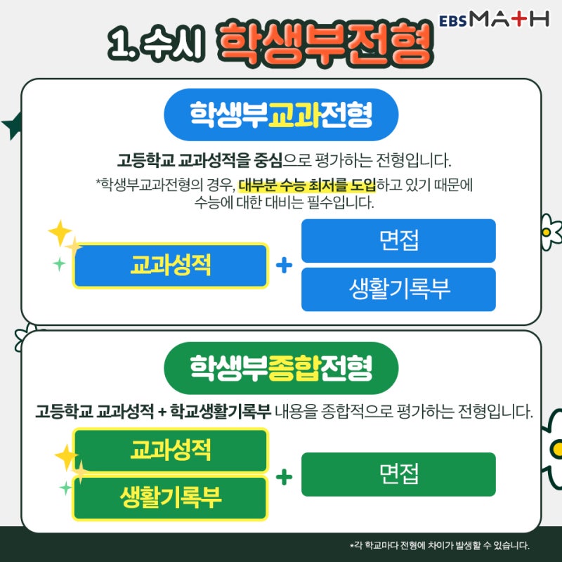 이처럼 아직 대학 입시의 ‘기본 개념’을 파악하지 못해 시작을 망설이는 학생들이 있다. 일반고는 ‘대학입학’에 투자하지 않기 때문에 교사들은 이런 개념에 관심이 없고, 입시컨설팅 학원도 ‘당연히 알고 있다’는 개념이어야 한다고 생각하고 굳이 설명하지 않는 사람도 있다. 이런 분들을 위해 오늘 글은 ‘입시 기본 개념’에 초점을 맞춰보겠습니다. 원하는 대학에 ‘합격’할 확률을 높이려면 어떤 입학 절차를 선택해야 하는지 설명하고 안내해 드립니다. 대학 진학을 준비하고 싶은 마음은 있지만 처음부터 단계별로 도와줄 사람이 없다면 잠시 시간을 내어 이 글을 읽어보시기 바랍니다. 주의 깊게 읽으십시오. 수시전형의 종류, 실질적인 차이점은 무엇인가요?