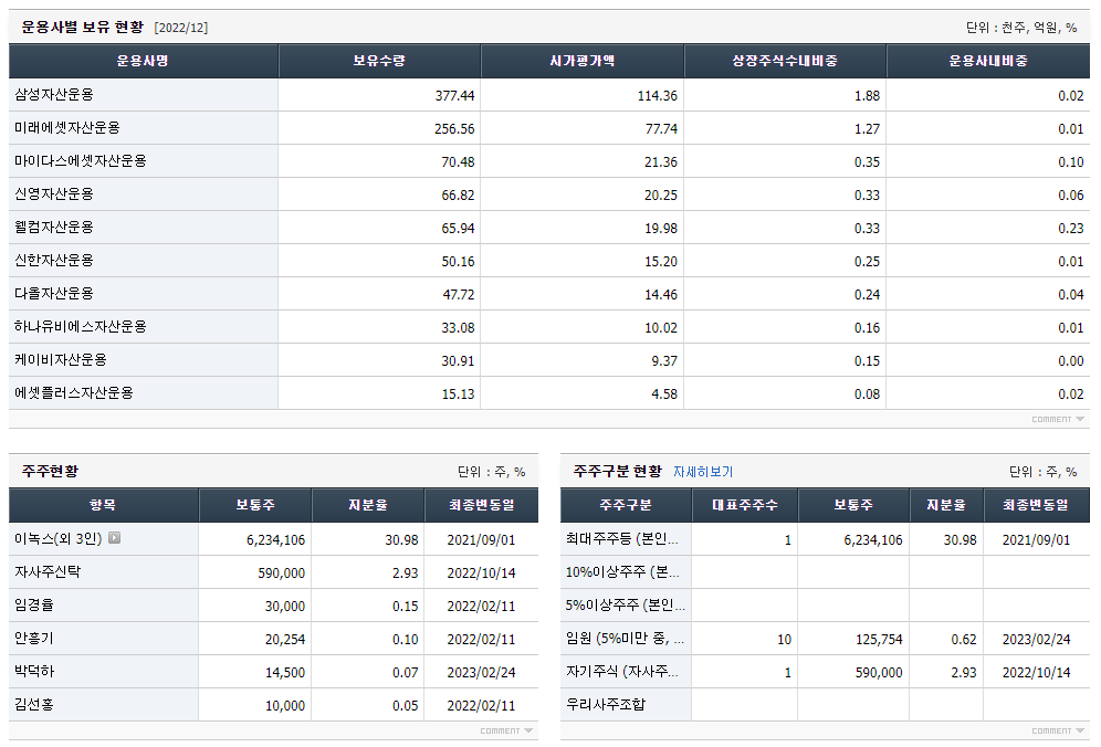 단기적으로 투자를 한다면 주주현황 정보가 필요없지만, 장기적으로는 회사의 가치를 보고 분석하기 시작할 때 경영진의 현황과 역량을 살펴보는 것도 필요합니다. 대주주에게 직접 질문을 할 수는 없지만, 어떻게 설정되어 있는지 살펴보는 것이 좋습니다.